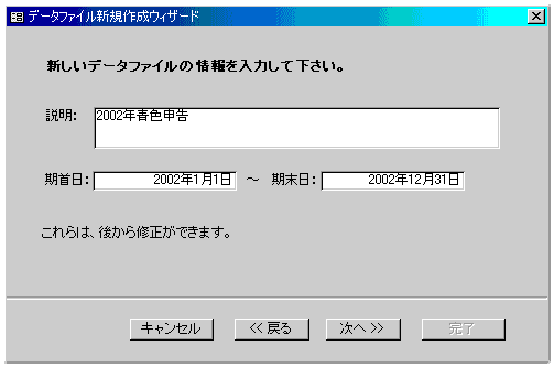 決算期間(期首日〜期末日)の規定値は、今年の1月1日〜12月31日です。必要に応じて修正して下さい。