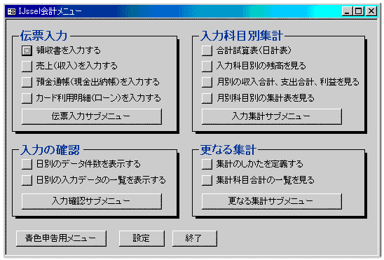データファイルが作成されて、接続すると、基本メニューが表示されます。